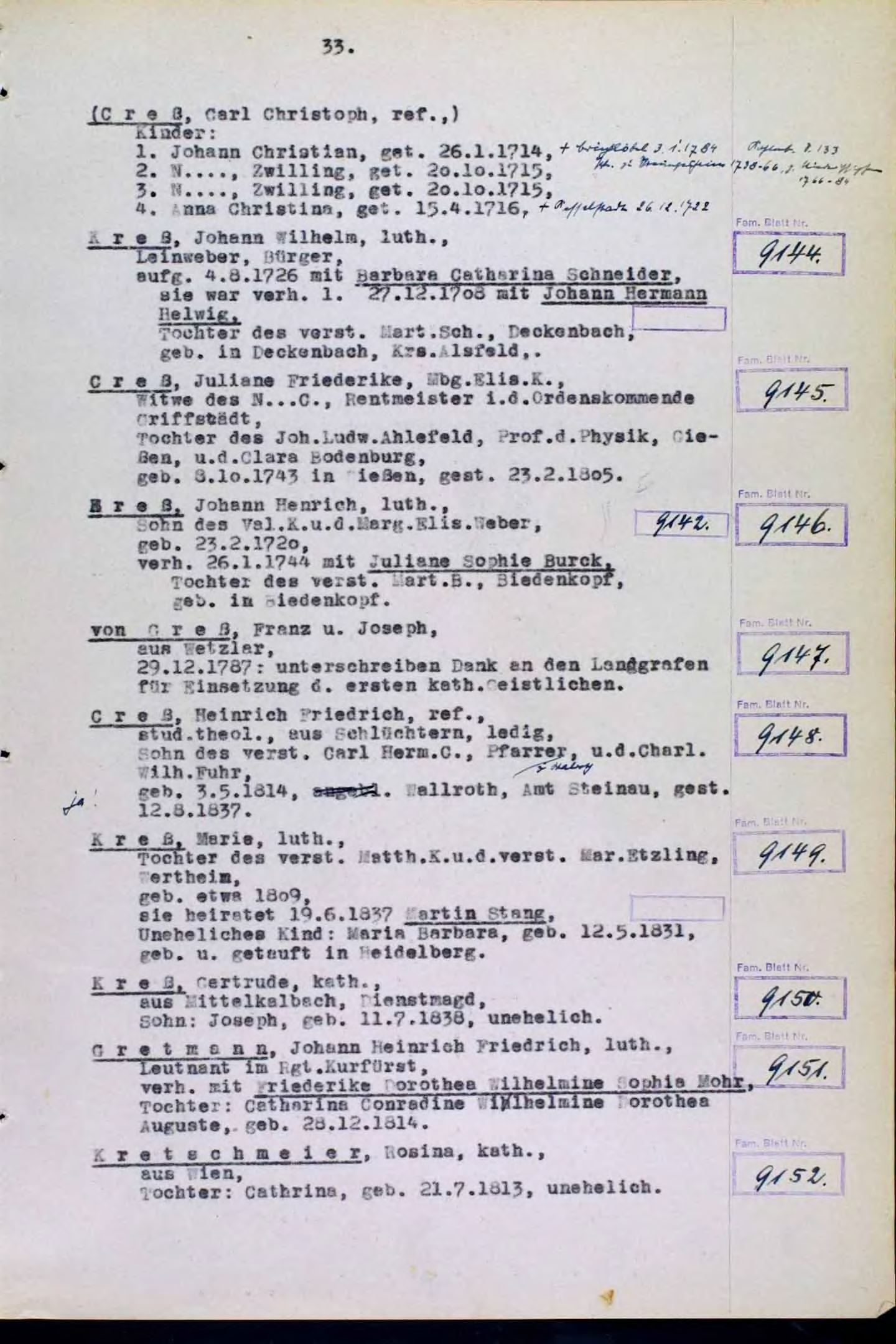 | Seit Fertigstellung des Marburger Sippenbuches 1950-1966 sind zahlreiche Ergänzungen und auch notwendige Korrekturen bekannt geworden. Zur aktuellen Seite existiert noch keine Ergänzunges- und Korrekturseite. Wenn Sie selbst Ergänzungen vornehmen möchten, wenden Sie sich bitte an Benutzer:Ernestus. |