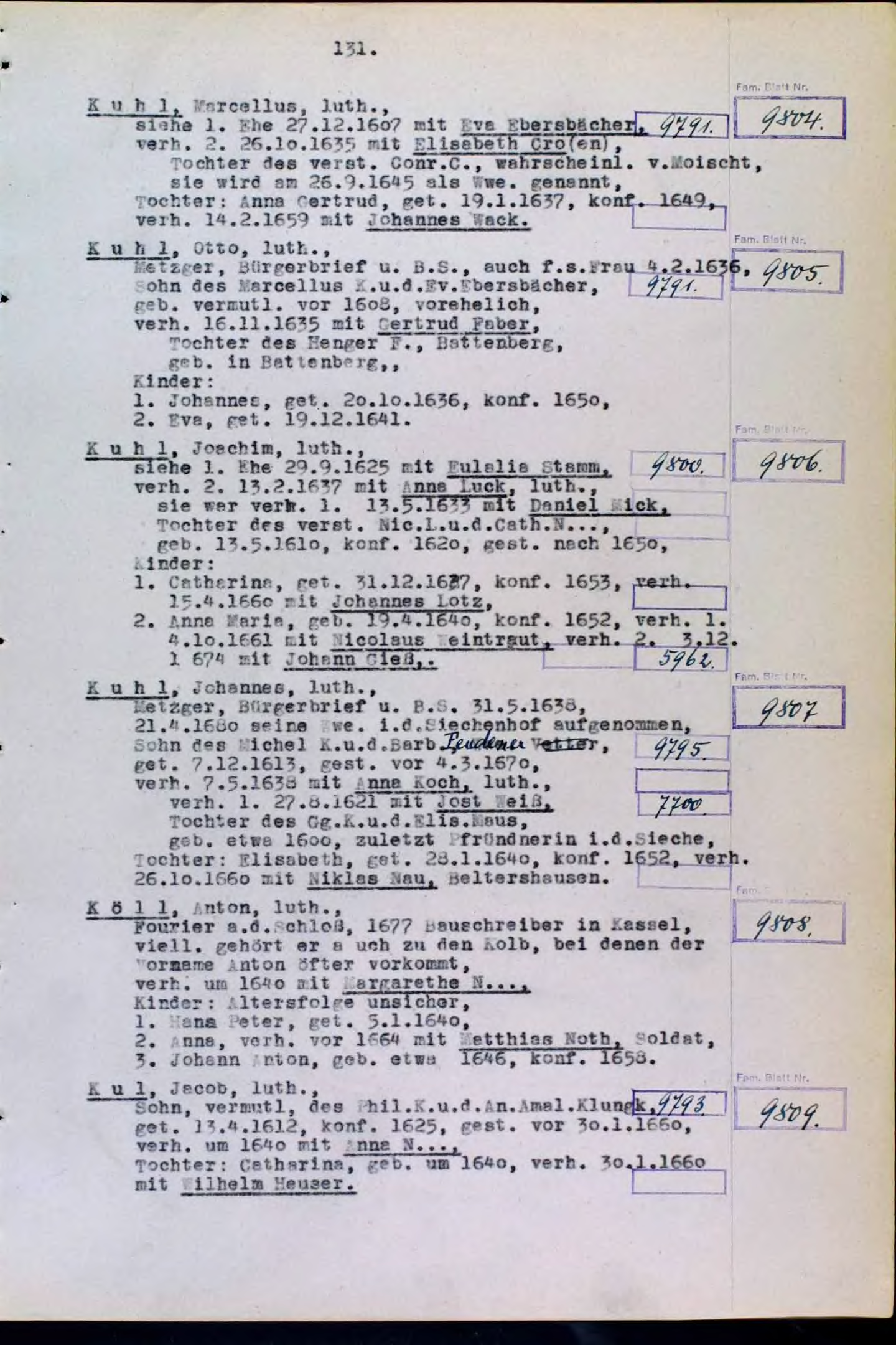 Info non-talk.svg Seit Fertigstellung des Marburger Sippenbuches 1950-1966 sind zahlreiche Ergänzungen und auch notwendige Korrekturen bekannt geworden. Zur aktuellen Seite existiert noch keine Ergänzunges- und Korrekturseite. Wenn Sie selbst Ergänzungen vornehmen möchten, wenden Sie sich bitte an Benutzer:Ernestus.