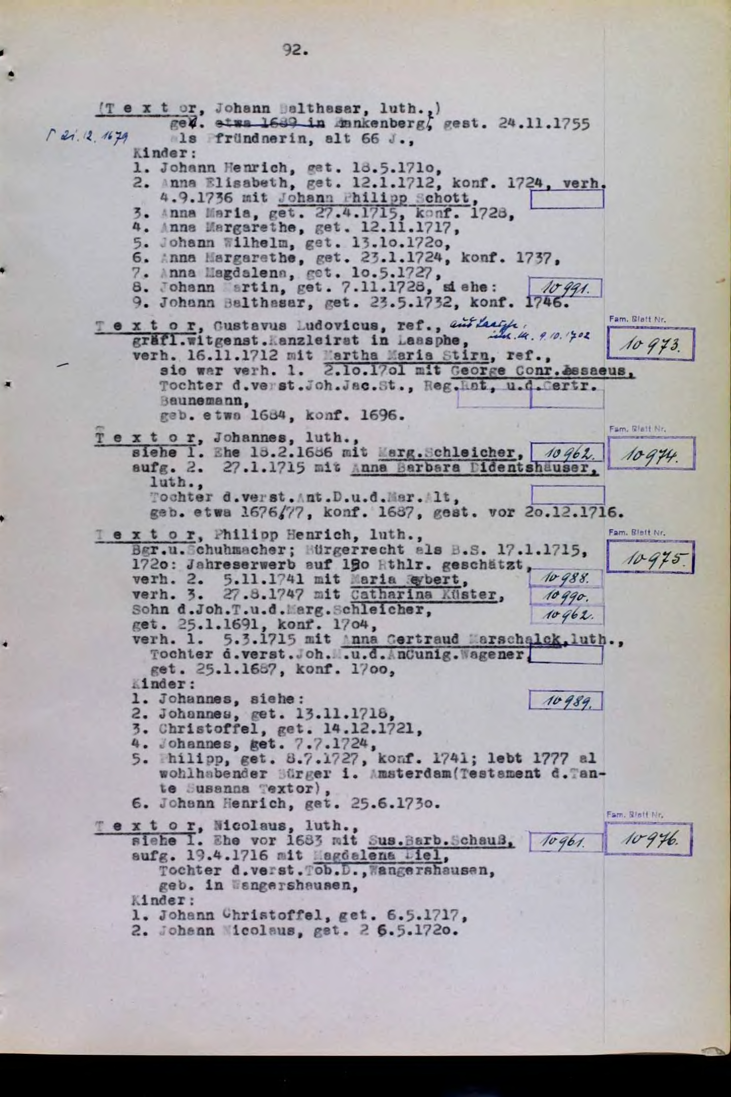 | Seit Fertigstellung des Marburger Sippenbuches 1950-1966 sind zahlreiche Ergänzungen und auch notwendige Korrekturen bekannt geworden. Zur aktuellen Seite existiert noch keine Ergänzunges- und Korrekturseite. Wenn Sie selbst Ergänzungen vornehmen möchten, wenden Sie sich bitte an Benutzer:Ernestus. |