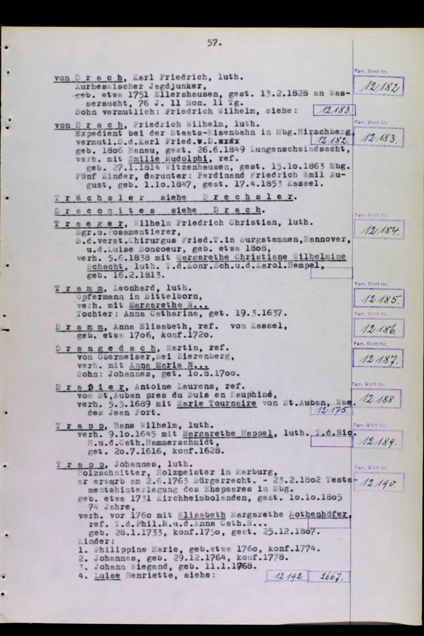| Seit Fertigstellung des Marburger Sippenbuches 1950-1966 sind zahlreiche Ergänzungen und auch notwendige Korrekturen bekannt geworden. Zur aktuellen Seite existiert noch keine Ergänzunges- und Korrekturseite. Wenn Sie selbst Ergänzungen vornehmen möchten, wenden Sie sich bitte an Benutzer:Ernestus. |