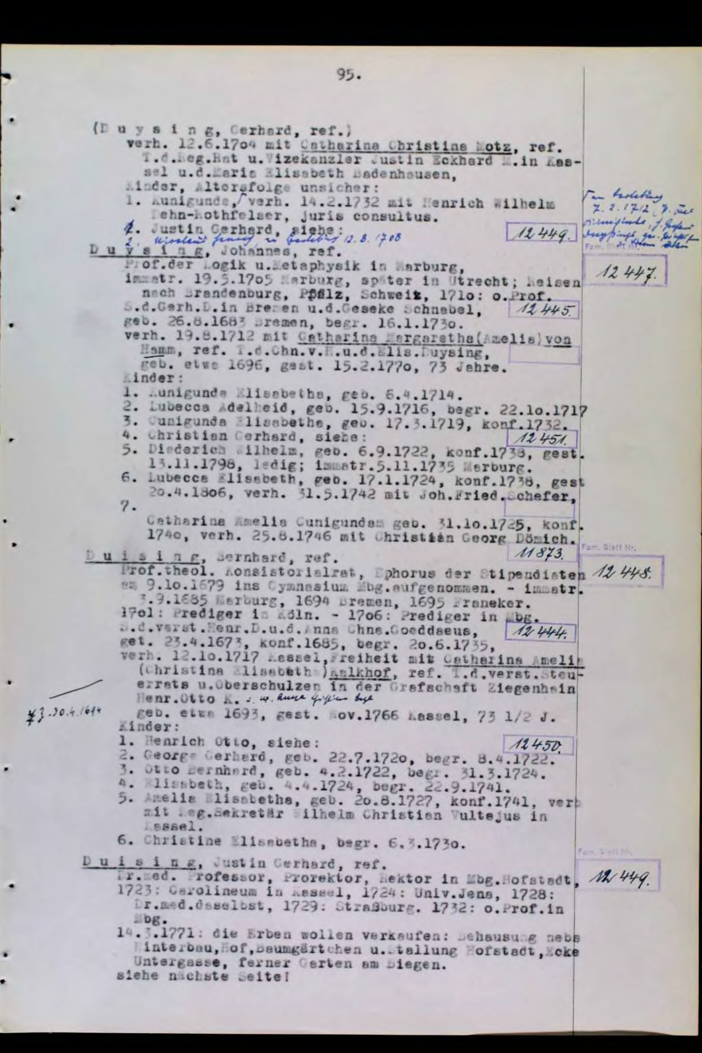 | Seit Fertigstellung des Marburger Sippenbuches 1950-1966 sind zahlreiche Ergänzungen und auch notwendige Korrekturen bekannt geworden. Zur aktuellen Seite existiert noch keine Ergänzunges- und Korrekturseite. Wenn Sie selbst Ergänzungen vornehmen möchten, wenden Sie sich bitte an Benutzer:Ernestus. |