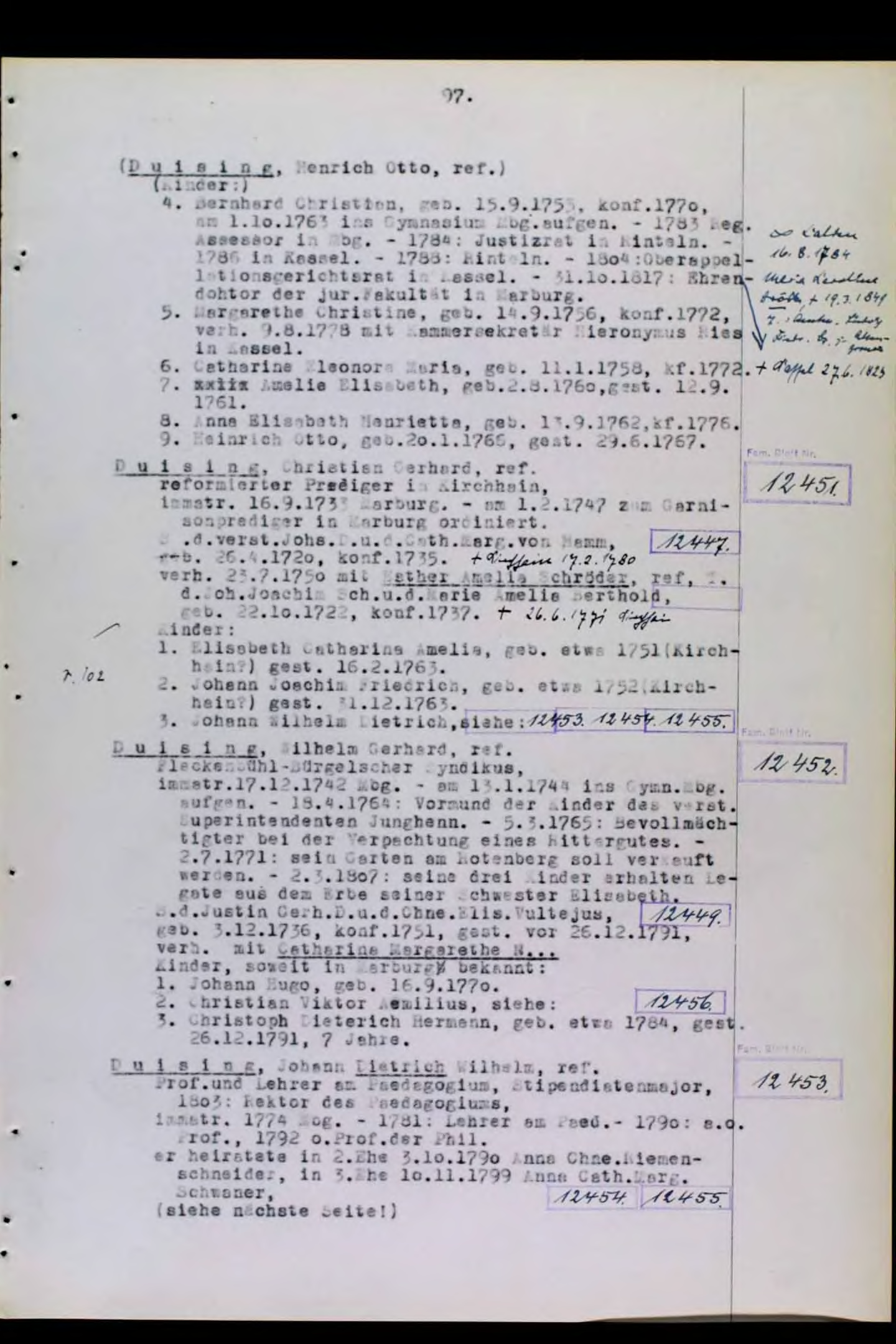 Info non-talk.svg Seit Fertigstellung des Marburger Sippenbuches 1950-1966 sind zahlreiche Ergänzungen und auch notwendige Korrekturen bekannt geworden. Zur aktuellen Seite existiert noch keine Ergänzunges- und Korrekturseite. Wenn Sie selbst Ergänzungen vornehmen möchten, wenden Sie sich bitte an Benutzer:Ernestus.