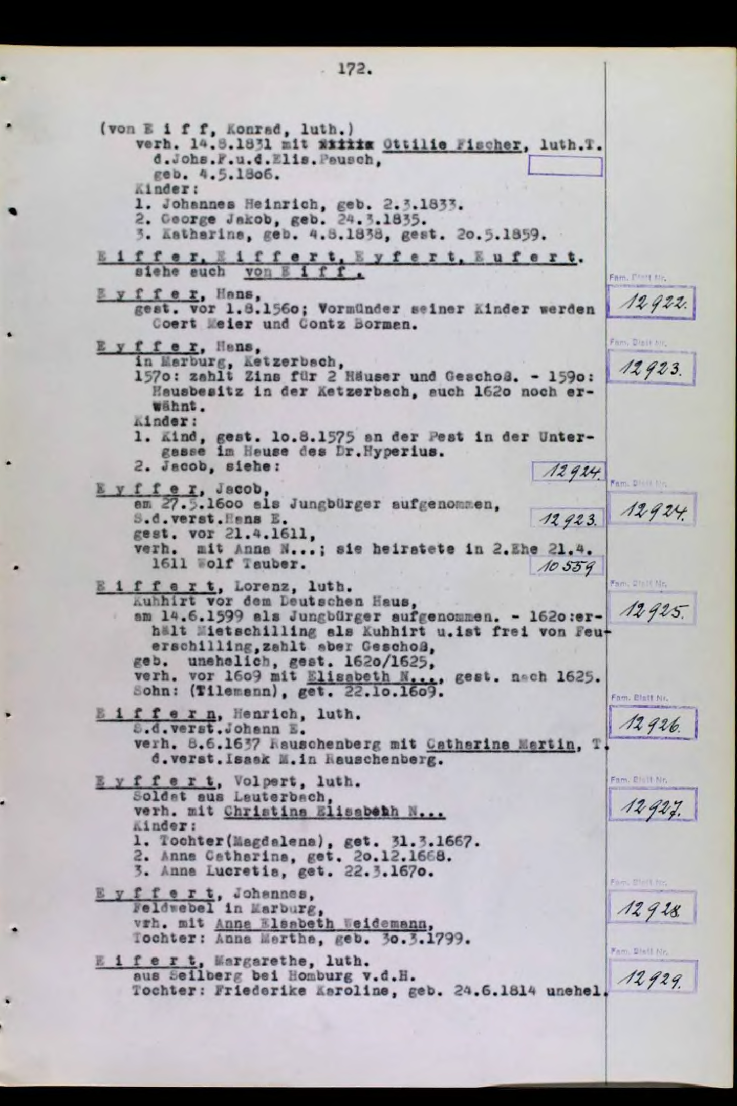 Info non-talk.svg Seit Fertigstellung des Marburger Sippenbuches 1950-1966 sind zahlreiche Ergänzungen und auch notwendige Korrekturen bekannt geworden. Zur aktuellen Seite existiert noch keine Ergänzunges- und Korrekturseite. Wenn Sie selbst Ergänzungen vornehmen möchten, wenden Sie sich bitte an Benutzer:Ernestus.