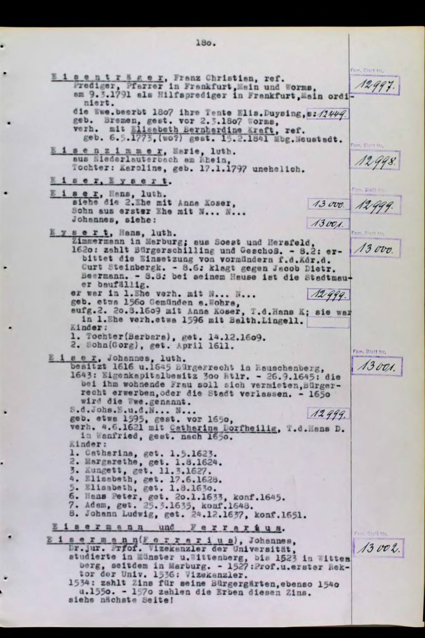 Info non-talk.svg Seit Fertigstellung des Marburger Sippenbuches 1950-1966 sind zahlreiche Ergänzungen und auch notwendige Korrekturen bekannt geworden. Zur aktuellen Seite existiert noch keine Ergänzunges- und Korrekturseite. Wenn Sie selbst Ergänzungen vornehmen möchten, wenden Sie sich bitte an Benutzer:Ernestus.