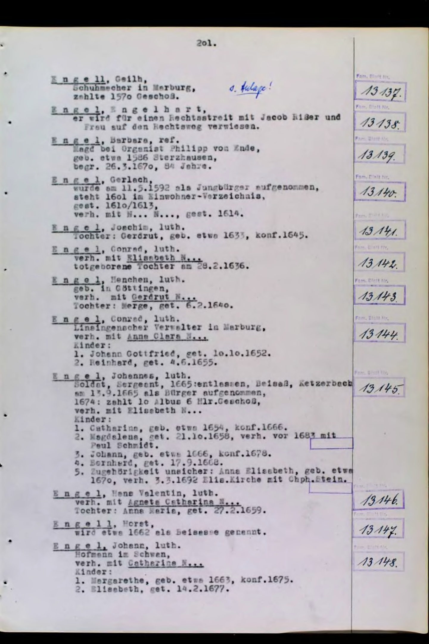 | Seit Fertigstellung des Marburger Sippenbuches 1950-1966 sind zahlreiche Ergänzungen und auch notwendige Korrekturen bekannt geworden. Zur aktuellen Seite existiert noch keine Ergänzunges- und Korrekturseite. Wenn Sie selbst Ergänzungen vornehmen möchten, wenden Sie sich bitte an Benutzer:Ernestus. |