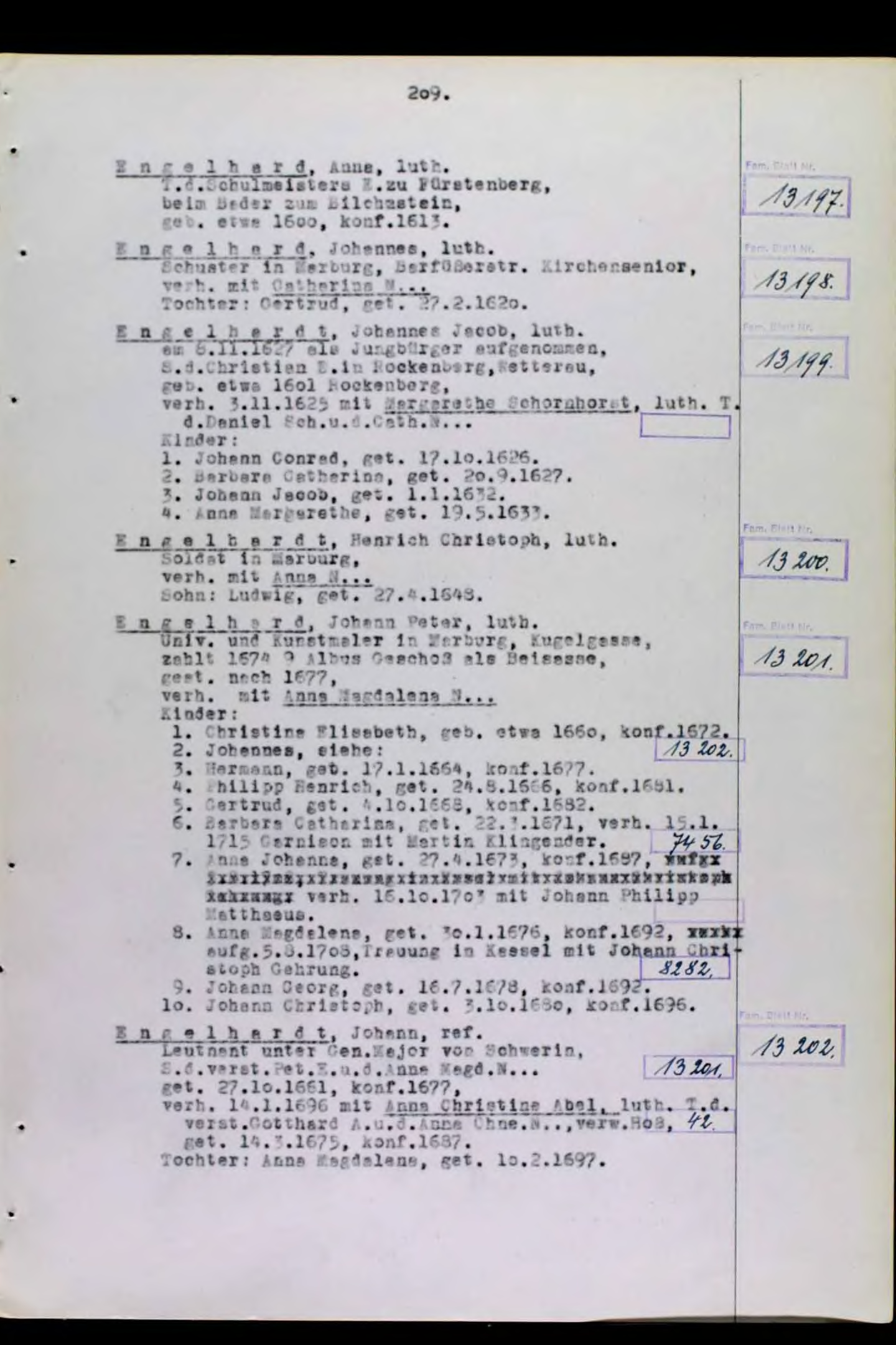 Info non-talk.svg Seit Fertigstellung des Marburger Sippenbuches 1950-1966 sind zahlreiche Ergänzungen und auch notwendige Korrekturen bekannt geworden. Zur aktuellen Seite existiert noch keine Ergänzunges- und Korrekturseite. Wenn Sie selbst Ergänzungen vornehmen möchten, wenden Sie sich bitte an Benutzer:Ernestus.