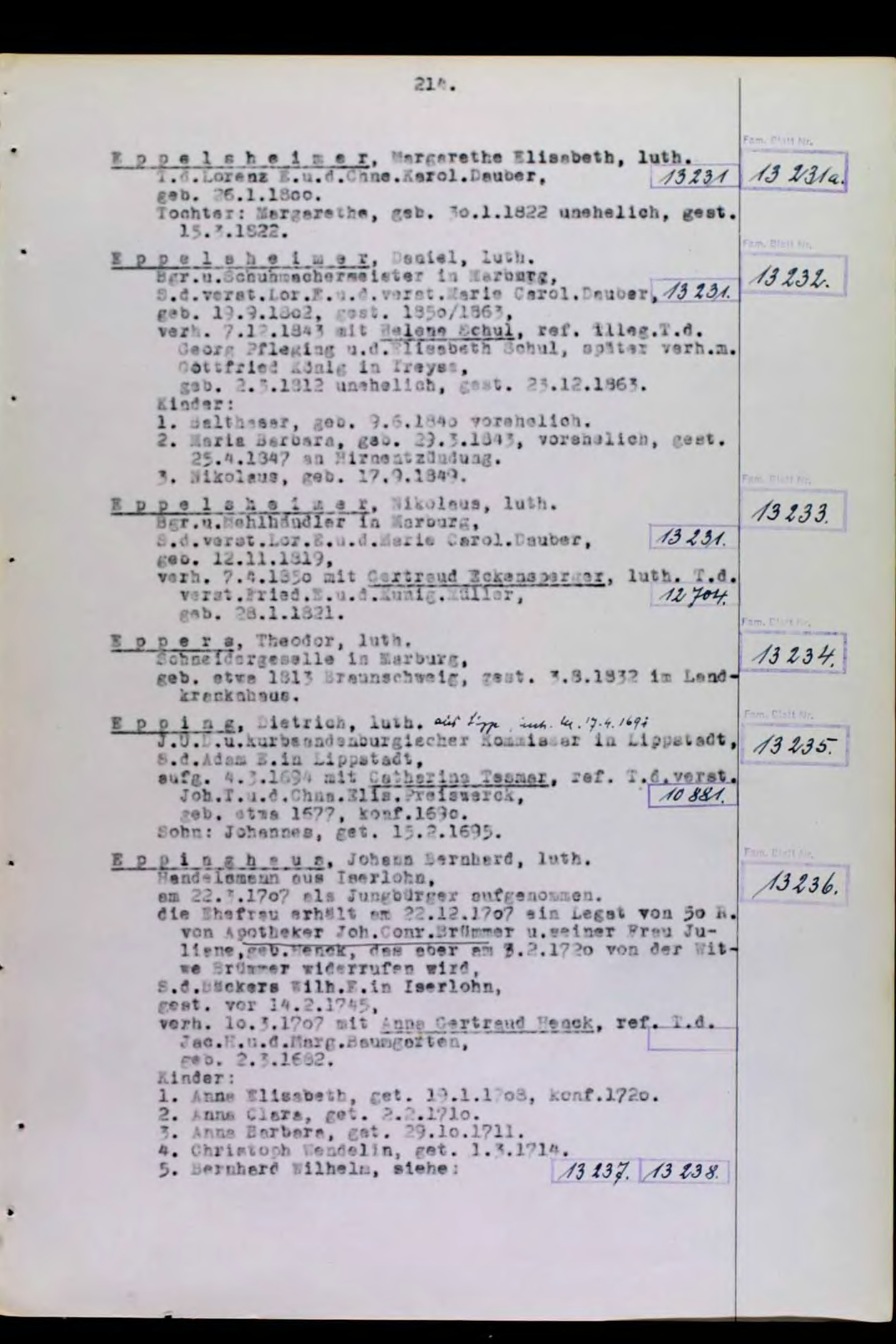 | Seit Fertigstellung des Marburger Sippenbuches 1950-1966 sind zahlreiche Ergänzungen und auch notwendige Korrekturen bekannt geworden. Zur aktuellen Seite existiert noch keine Ergänzunges- und Korrekturseite. Wenn Sie selbst Ergänzungen vornehmen möchten, wenden Sie sich bitte an Benutzer:Ernestus. |