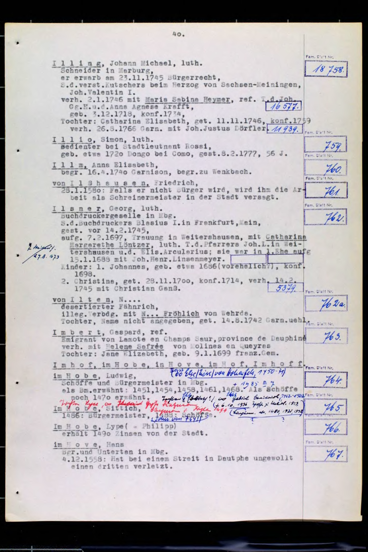Info non-talk.svg Seit Fertigstellung des Marburger Sippenbuches 1950-1966 sind zahlreiche Ergänzungen und auch notwendige Korrekturen bekannt geworden. Zur aktuellen Seite existiert noch keine Ergänzunges- und Korrekturseite. Wenn Sie selbst Ergänzungen vornehmen möchten, wenden Sie sich bitte an Benutzer:Ernestus.