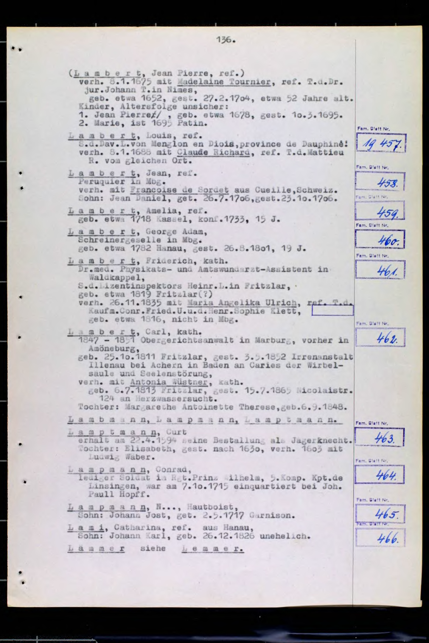 Info non-talk.svg Seit Fertigstellung des Marburger Sippenbuches 1950-1966 sind zahlreiche Ergänzungen und auch notwendige Korrekturen bekannt geworden. Zur aktuellen Seite existiert noch keine Ergänzunges- und Korrekturseite. Wenn Sie selbst Ergänzungen vornehmen möchten, wenden Sie sich bitte an Benutzer:Ernestus.