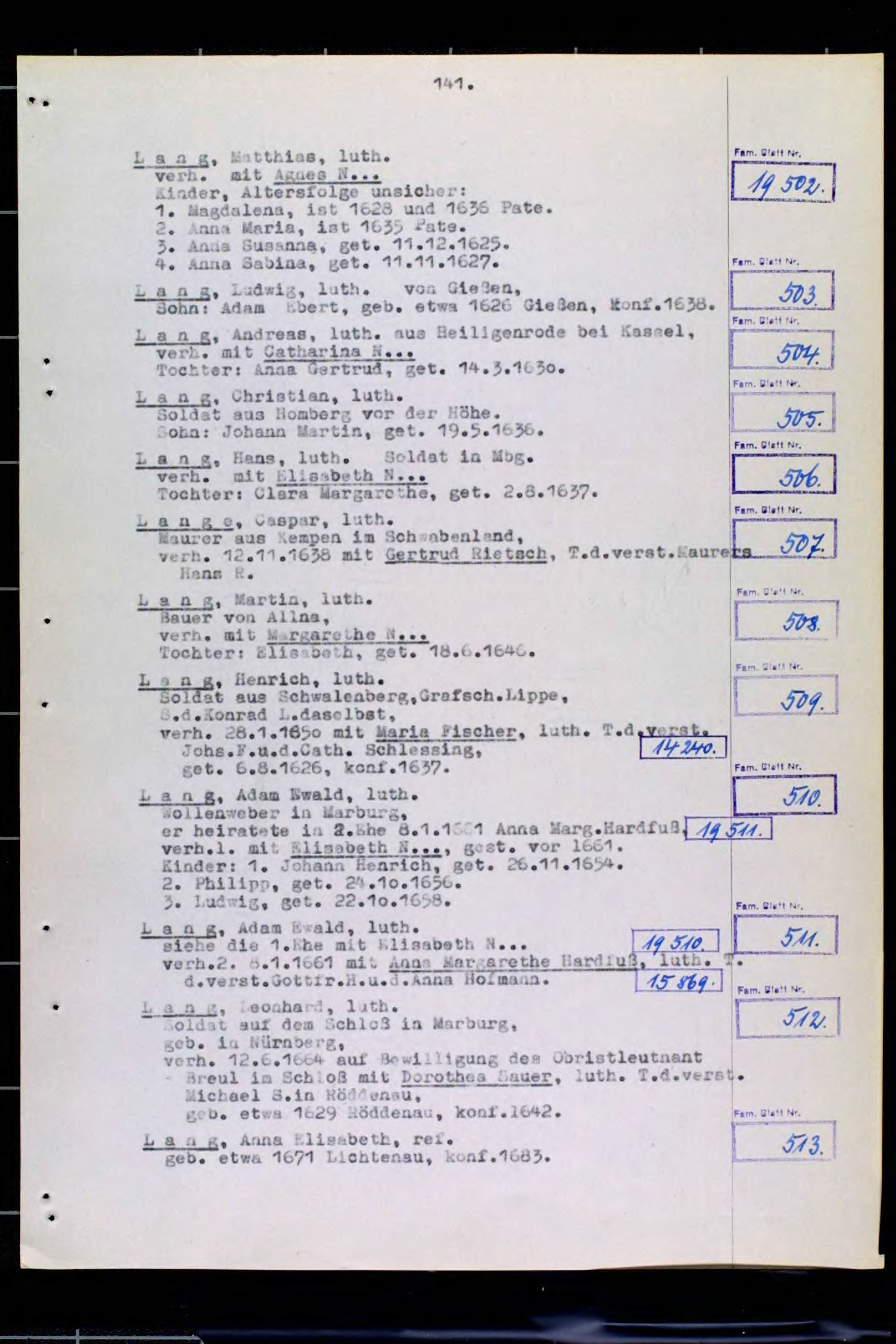 Info non-talk.svg Seit Fertigstellung des Marburger Sippenbuches 1950-1966 sind zahlreiche Ergänzungen und auch notwendige Korrekturen bekannt geworden. Zur aktuellen Seite existiert noch keine Ergänzunges- und Korrekturseite. Wenn Sie selbst Ergänzungen vornehmen möchten, wenden Sie sich bitte an Benutzer:Ernestus.