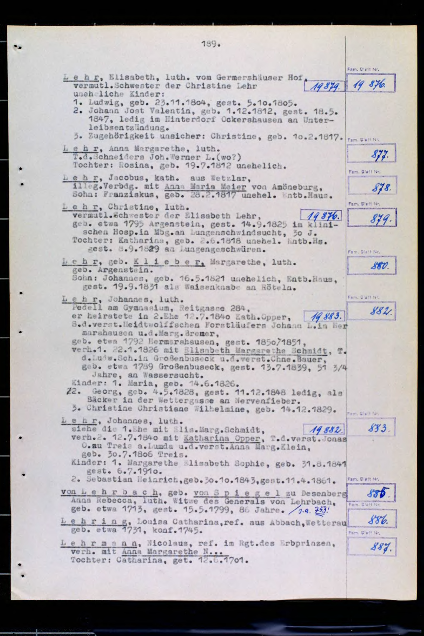 Info non-talk.svg Seit Fertigstellung des Marburger Sippenbuches 1950-1966 sind zahlreiche Ergänzungen und auch notwendige Korrekturen bekannt geworden. Zur aktuellen Seite existiert noch keine Ergänzunges- und Korrekturseite. Wenn Sie selbst Ergänzungen vornehmen möchten, wenden Sie sich bitte an Benutzer:Ernestus.