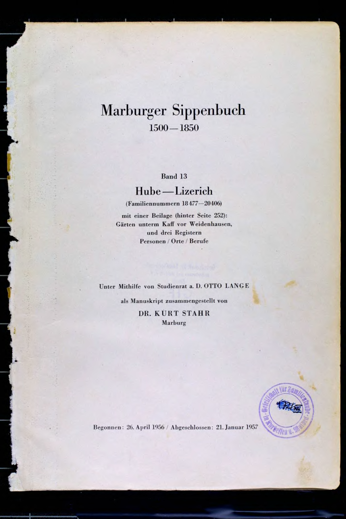 Das Marburger Sippenbuch wird in der Digitalen Bibliothek des Vereins für Computergenealogie e.V. veröffentlicht durch die Gesellschaft für Familienkunde in Kurhessen und Waldeck e.V. (GFKW) mit freundlicher Zustimmung der Erben von Dr. Kurt Stahr. Der Ergänzungsband 1 (Band 24) wird hier veröffentlicht mit freundlicher Zustimmung des Bearbeiters Werner Guth.