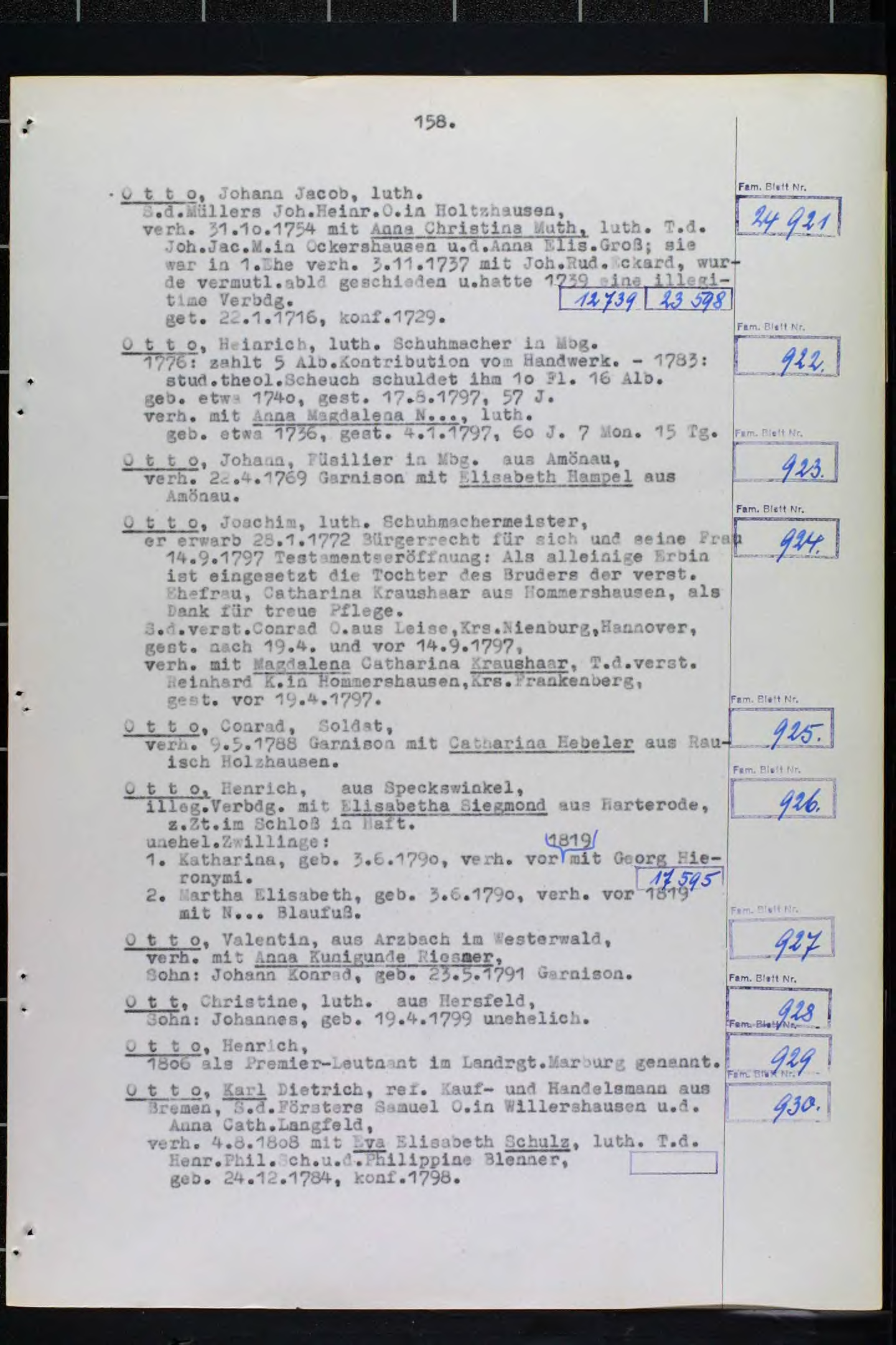 Info non-talk.svg Seit Fertigstellung des Marburger Sippenbuches 1950-1966 sind zahlreiche Ergänzungen und auch notwendige Korrekturen bekannt geworden. Zur aktuellen Seite existiert noch keine Ergänzunges- und Korrekturseite. Wenn Sie selbst Ergänzungen vornehmen möchten, wenden Sie sich bitte an Benutzer:Ernestus.