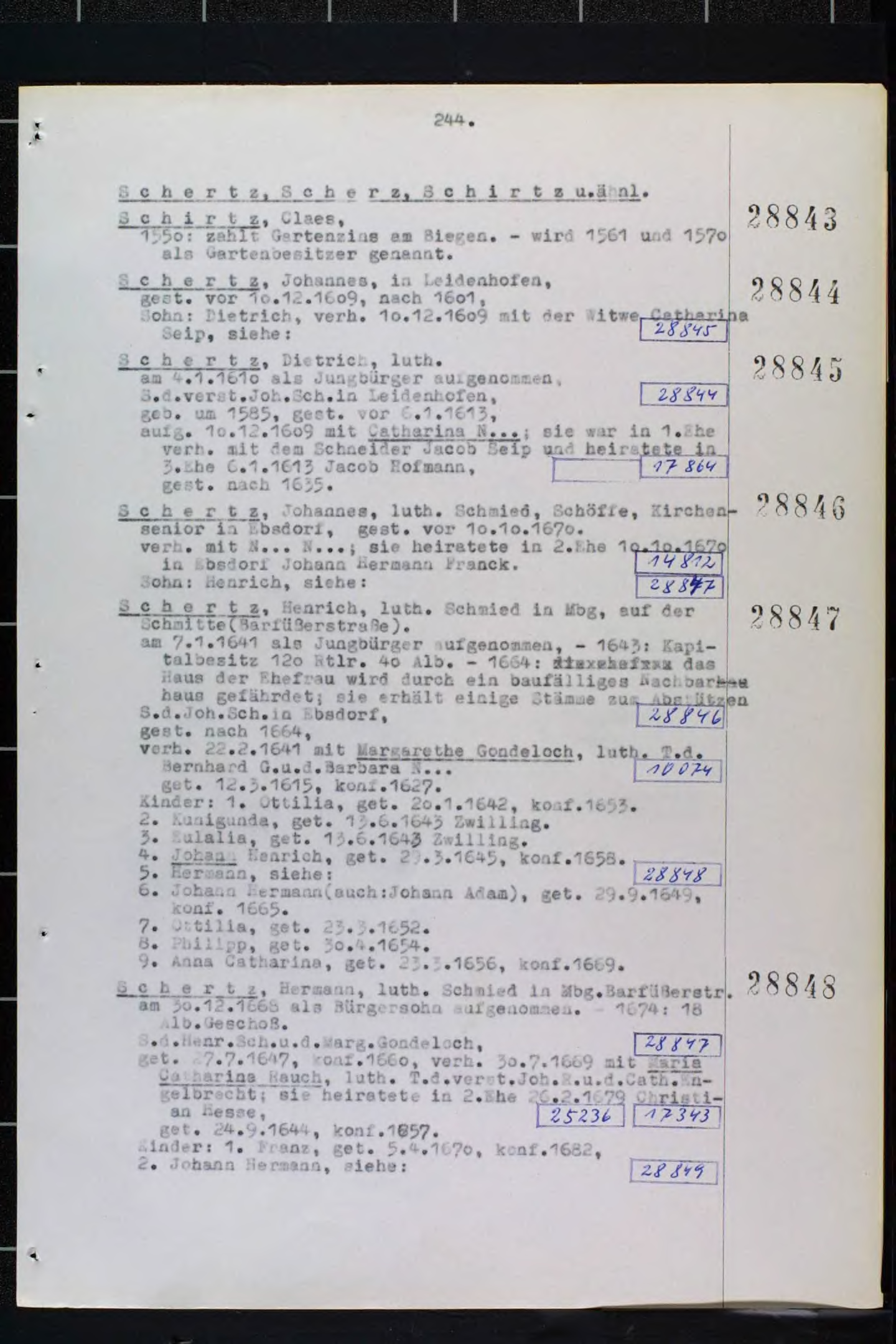 Info non-talk.svg Seit Fertigstellung des Marburger Sippenbuches 1950-1966 sind zahlreiche Ergänzungen und auch notwendige Korrekturen bekannt geworden. Zur aktuellen Seite existiert noch keine Ergänzunges- und Korrekturseite. Wenn Sie selbst Ergänzungen vornehmen möchten, wenden Sie sich bitte an Benutzer:Ernestus.