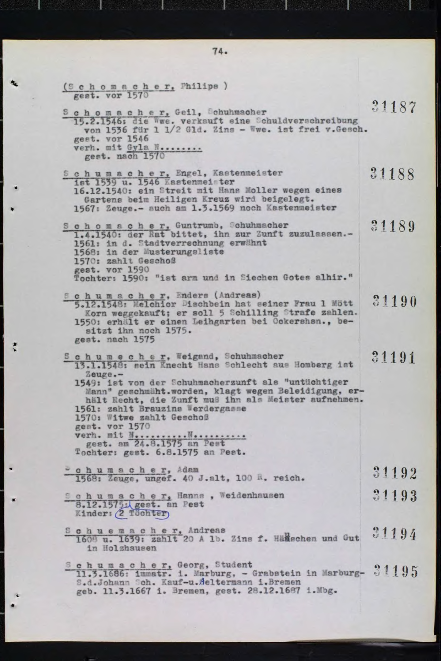 | Seit Fertigstellung des Marburger Sippenbuches 1950-1966 sind zahlreiche Ergänzungen und auch notwendige Korrekturen bekannt geworden. Zur aktuellen Seite existiert noch keine Ergänzunges- und Korrekturseite. Wenn Sie selbst Ergänzungen vornehmen möchten, wenden Sie sich bitte an Benutzer:Ernestus. |