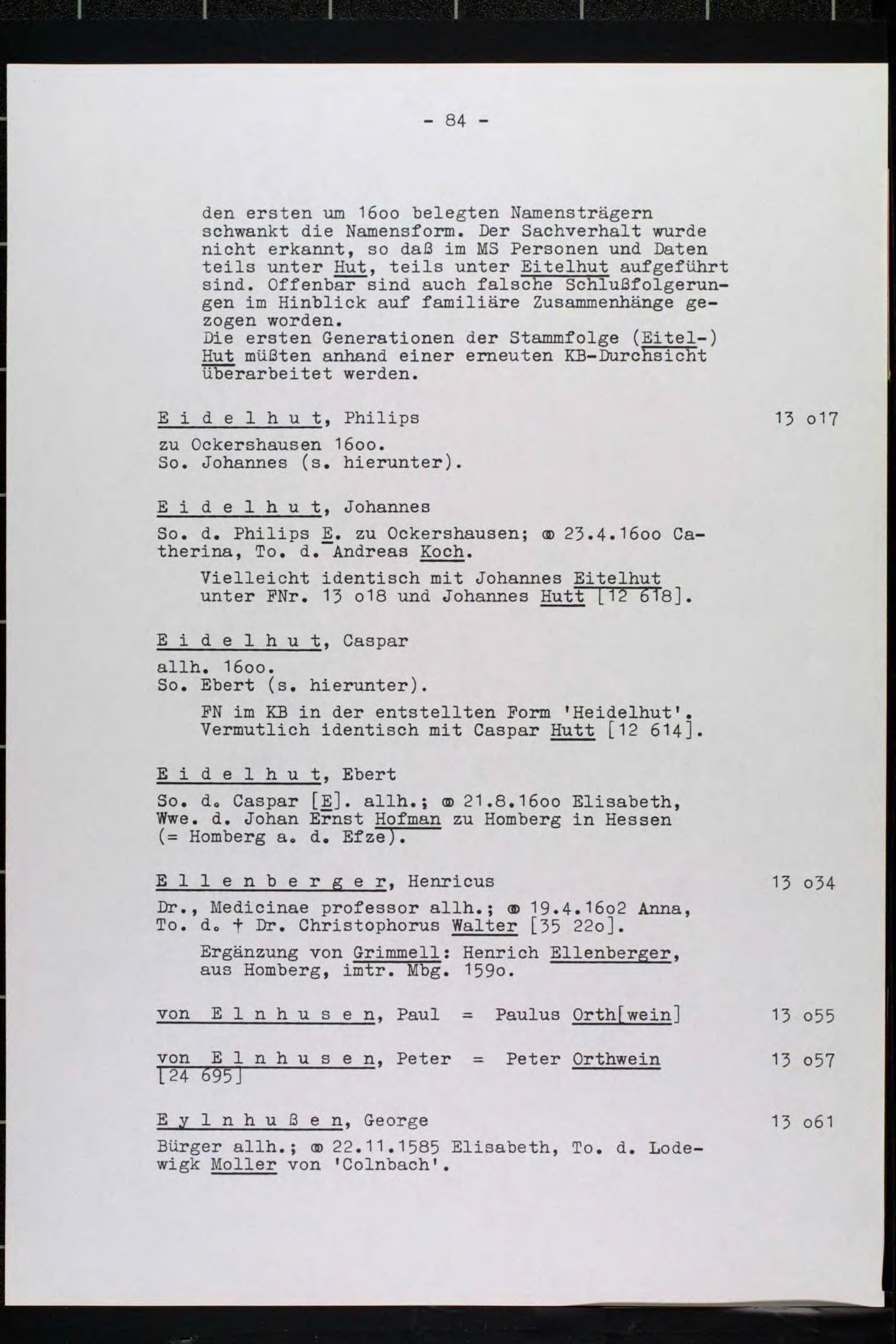 | Seit Fertigstellung des Marburger Sippenbuches 1950-1966 sind zahlreiche Ergänzungen und auch notwendige Korrekturen bekannt geworden. Zur aktuellen Seite existiert noch keine Ergänzunges- und Korrekturseite. Wenn Sie selbst Ergänzungen vornehmen möchten, wenden Sie sich bitte an Benutzer:Ernestus. |