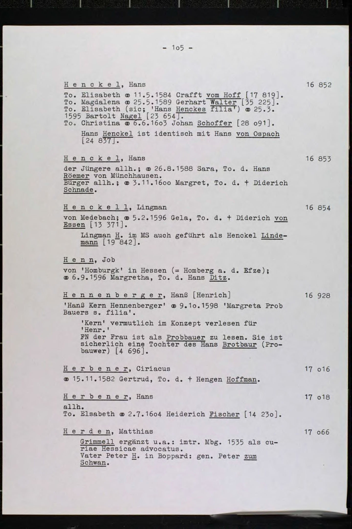 | Seit Fertigstellung des Marburger Sippenbuches 1950-1966 sind zahlreiche Ergänzungen und auch notwendige Korrekturen bekannt geworden. Zur aktuellen Seite existiert noch keine Ergänzunges- und Korrekturseite. Wenn Sie selbst Ergänzungen vornehmen möchten, wenden Sie sich bitte an Benutzer:Ernestus. |