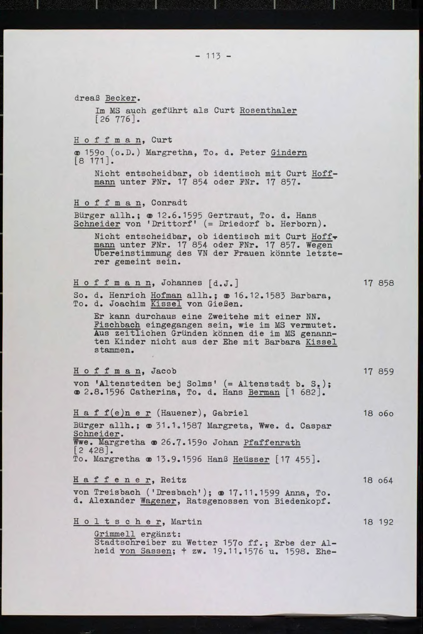 Info non-talk.svg Seit Fertigstellung des Marburger Sippenbuches 1950-1966 sind zahlreiche Ergänzungen und auch notwendige Korrekturen bekannt geworden. Zur aktuellen Seite existiert noch keine Ergänzunges- und Korrekturseite. Wenn Sie selbst Ergänzungen vornehmen möchten, wenden Sie sich bitte an Benutzer:Ernestus.