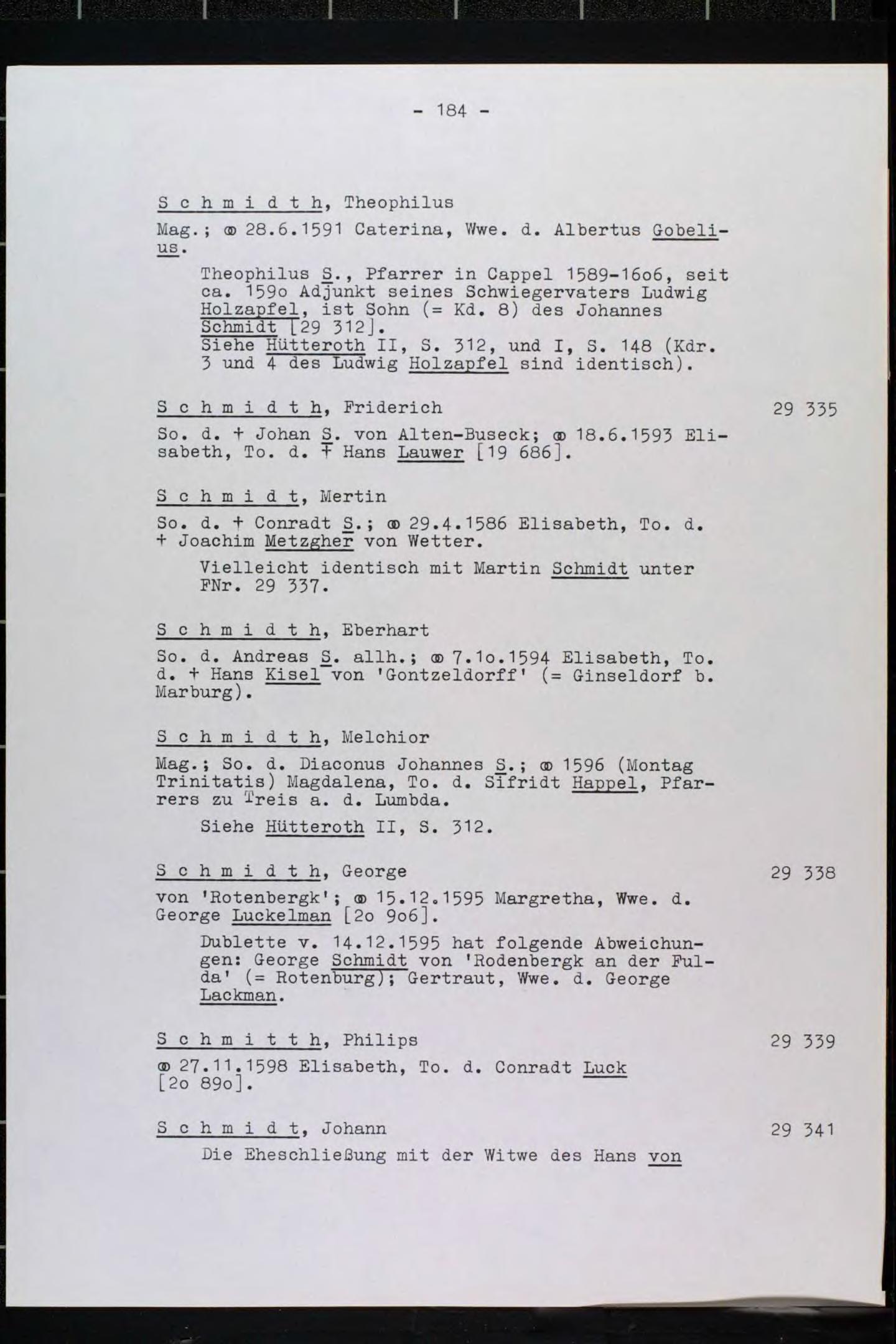 | Seit Fertigstellung des Marburger Sippenbuches 1950-1966 sind zahlreiche Ergänzungen und auch notwendige Korrekturen bekannt geworden. Zur aktuellen Seite existiert noch keine Ergänzunges- und Korrekturseite. Wenn Sie selbst Ergänzungen vornehmen möchten, wenden Sie sich bitte an Benutzer:Ernestus. |