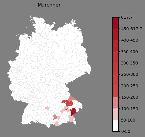 Relative Verteilung des Namens Marchner (1996)Direkt zur Karte Die Farbskala zeigt die Anzahl von "Marchner" bezogen auf je 1 Million Einträge. |