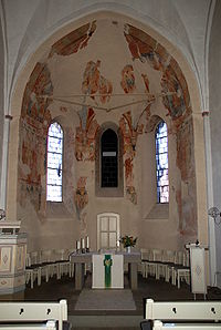 - Die Kirche stammt aus der Zeit um 1300 und ist mit Fresken aus dem 14. Jahrhundert ausgestattet.