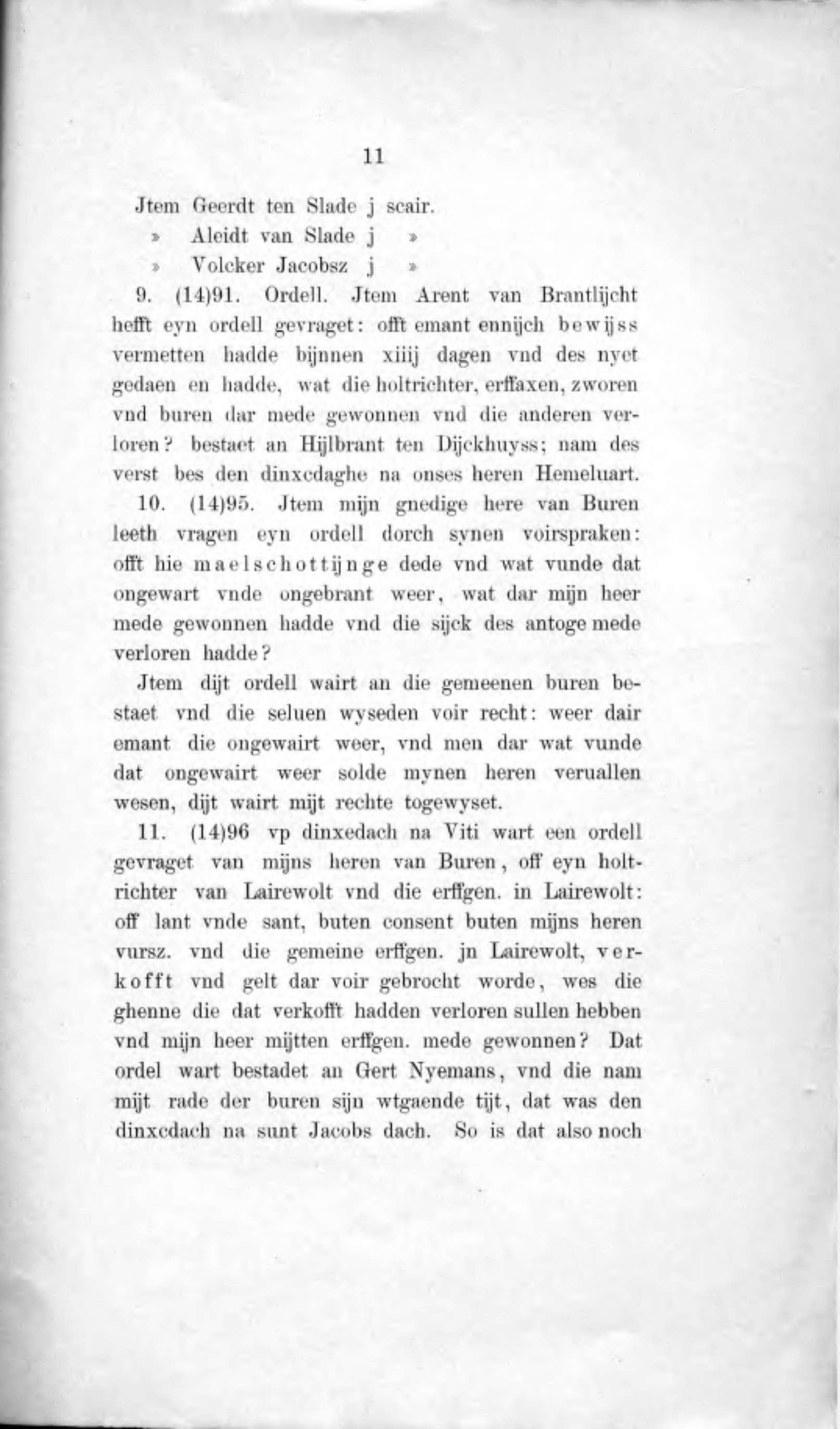 11 Jtem Geerdt ten Slade j scair. » Aleidt van Slade j » » Volcker Jacobsz j » 9. (14)91. Ordell. Jtem Arent van Brantlijcht hefft eyn ordell gevraget: offt emant ennijch bewijss vermetten hadde bijnnen xiiij dagen vnd des nyet gedaen en hadden wat die holtrichter, erffaxen, zworen vnd buren dar mede gewonnen vnd die anderen ver- loren? bestaet an Hijlbrant ten Dijckhuyss: nam des verst bes den dinxcdaghe na onses heren Hemeluart. 10. (14)90. Jtem mijn gnedige here van Buren leeth vragen eyn ordell dorch synen voirspraken: offt hiemaelschottijnge dede vnd wat vnnde dat ongewart vnde ongebrant weer, wat dar mijn heer mede gewonnen hadde vnd die sijck des antoge mede verloren hadde ? Jtem dijt ordell wairt an die gemeenen buren be- staet vnd die seinen wyseden voir recht: weer dair emant die ongewairt weer, vnd men dar wat vunde dat ongewairt weer solde mynen heren veruallen wesen, dijt wairt mijt rechte togewyset. 11. (14)96 vp dinxedach na Viti wart een ordell gevraget van mijns heren van Buren, off eyn holt- richter van Lairewolt vnd die erffgen. in Lairewolt: off lant vnde sant. buten consent buten mijns heren vursz. vnd die gemeine erffgen. jn Lairewolt, ver- kofft vnd geit dar voir gebrocht worde, wes die ghenne die dat verkofft hadden verloren sullen hebben vnd mijn beer mijtten erffgen. mede gewonnen? Dat ordel wart bestadet an Gert Nyemans, vnd die nam mijt rade der buren sijn wtgaende tijt, dat was den dinxcdach na sunt Jacobs dach. So is dat also noch