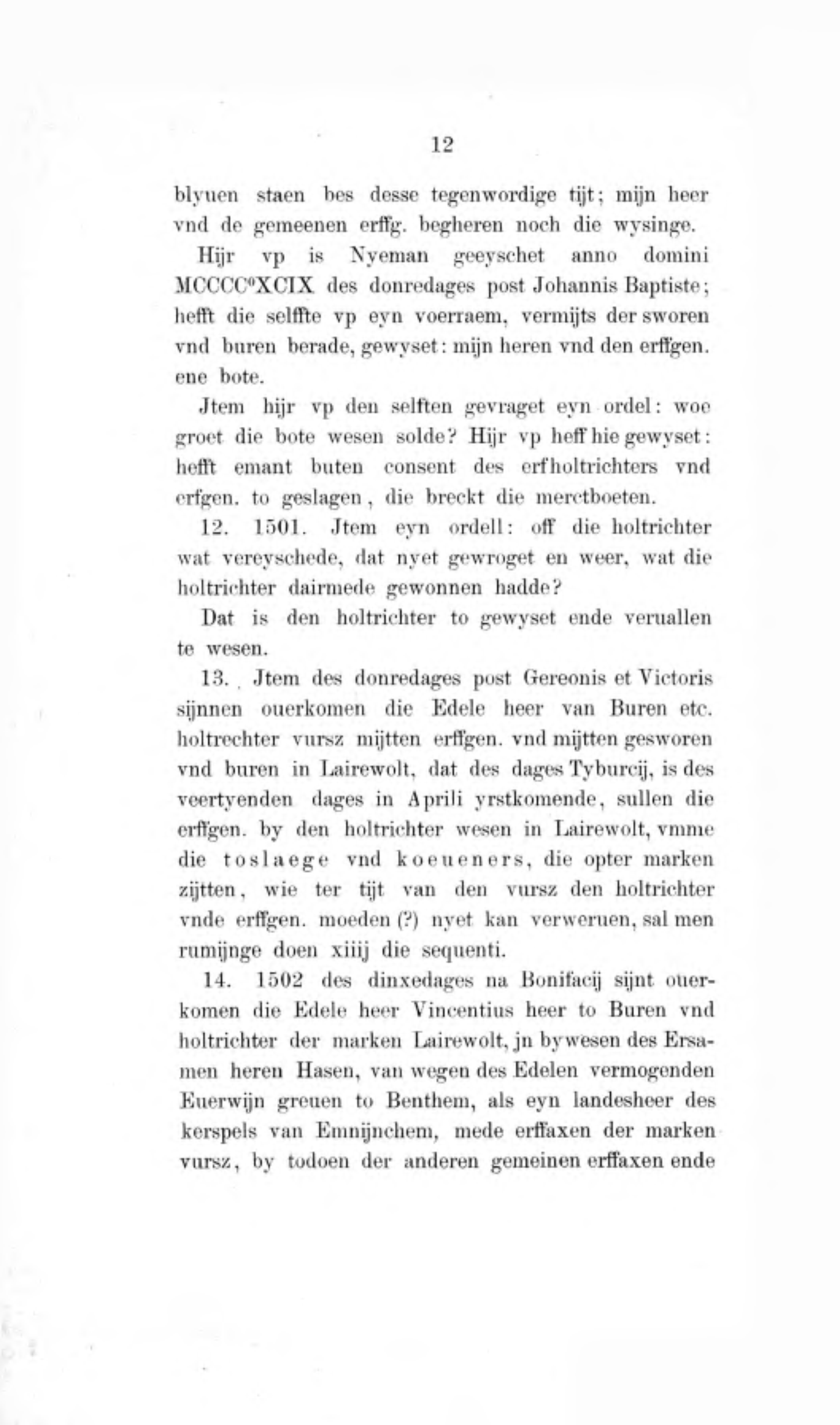 12 blyuen staen bes desse tegenwordige tijt; mijn heer vnd de gemeenen erffg. begheren noch die wysinge. Hijr vp is Nyeman geeyschet anno domini MCCCC°XCIX des donredages post Johannis Baptiste; hefft die selffte vp eyn voerraem, vermijts der sworen vnd buren berade, gewyset: mijn heren vnd den erffgen. ene bote. Jtem hijr vp den selften gevraget eyn ordel: woe groet die bote wesen solde? Hijr vp heff hie gewyset: hefft emant buten consent des erfholtrichters vnd erfgen. to geslagen , die breekt die merctboeten. 12. 1501. Jtem evn ordell: off die holtrichter wat vereyschede, dat nyet gewroget en weer, wat die holtrichter dairmede gewonnen hadde? Dat is den holtrichter to gewyset ende veruallen te wesen. 13. . Jtem des donredages post Gereonis et Victoris sijnnen ouerkomen die Edele heer van Buren etc. holtrechter vursz mijtten erffgen. vnd mijtten gesworen vnd buren in Lairewolt, dat des dages Tyburcij, is des veertyenden dages in Aprili yrstkomende, sullen die erffgen. by den holtrichter wesen in Lairewolt, vmme die toslaege vnd koeueners, die opter marken zijtten, wie ter tijt van den vursz den holtrichter vnde erffgen. moeden (?) nyet kan verweruen, sal men rumijnge doen xiiij die sequenti. 14. 1502 des dinxedages na Bonifaeij sijnt, oner- komen die Edele heer Vincentius heer to Buren vnd holtrichter der marken Lairewolt, jn by wesen des Ersa- men heren Hasen, van wegen des Edelen vermogenden Euerwijn greuen to Benthem, als eyn landesheer des kerspels van Emnijnchem, mede erffaxen der marken vursz, by todoen der anderen gemeinen erffaxen ende