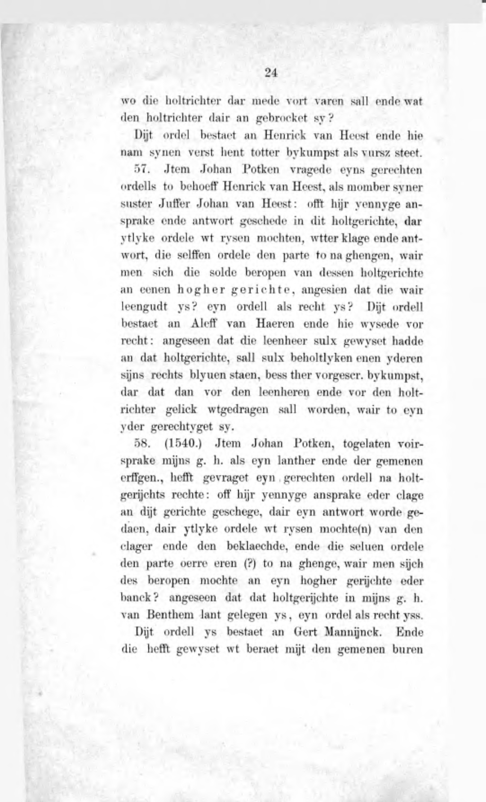24 wo die holtrichter dar mede vort varen sall ende wat den holtrichter dair an gebrocket sy ? Dijt ordel bestaet an Henrick van Heest ende hie nam synen verst hent totter bykumpst als vursz steet. 57. Jtem Johan Potken vragede eyns gerechten ordells to behoeff Henrick van Heest, als momber syner suster Juffer Johan van Heest: offt hijr vennyge an- sprake ende antwort gesellede iu dit holtgerichte, dar ytlyke ordele wt rysen mochten, wtter klage ende ant- wort, die selffen ordele den parte to na ghengen, wair men sich die solde beropen van dessen holtgerichte an eenen hogher gerichte, angesien dat die wair leengudt ys? eyn ordell als recht ys? Dijt ordell bestaet an Aleff van Haeren ende hie wysede vor recht: angeseen dat die leenheer sulx gewyset hadde an dat holtgerichte, sall sulx beholtlyken enen yderen sijns rechts blyuen staen, bess ther vorgescr. bykumpst, dar dat dan vor den leenheren ende vor den holt- richter gelick wtgedragen sall worden, wair to eyn yder gerechtvget sy. 58. (1540.) Jtem Johan Potken, togelaten voir- sprake mijns g. h. als eyn lanther ende der gemenen erffgen., hefft gevraget eyn, gerechten ordell na holt- gerijchts rechte: off hijr yennyge ansprake eder clage an dijt gerichte geschege, dair eyn antwort worde ge- daen, dair ytlyke ordele wt rysen mochte(n) van den clager ende den beklaechde, ende die seluen ordele den parte oerre eren (?) to na ghenge, wair men sijch des beropen mochte an eyn hogher gerijchte eder banck? angeseen dat dat holtgerijchte in mijns g. h . van Benthem lant gelegen ys, eyn ordel als recht yss. Dijt ordell ys bestaet an Gert Mannijnck. Ende die hefft gewyset wt beraet mijt den gemenen buren