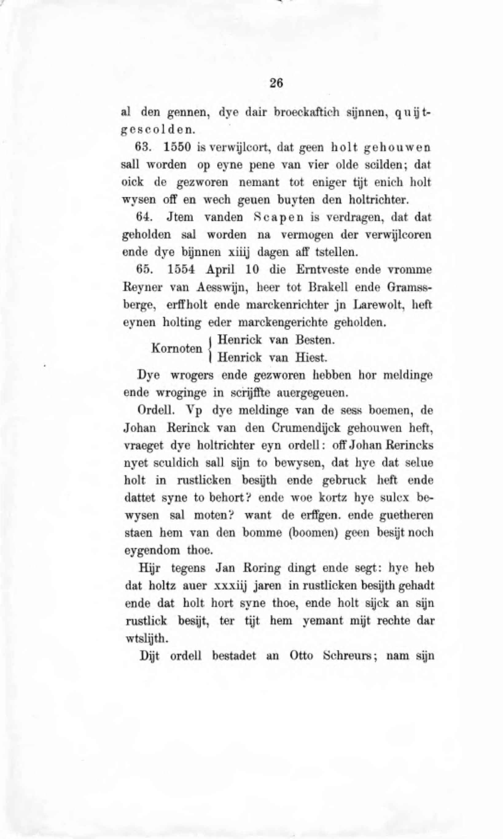 26 al den gennen, dye dair broeckaftich sijnnen, quijt- gescolden. 63. 1550 is verwijlcort, dat geen holt gehouwen sall worden op eyne pene van vier olde scilden; dat oick de gezworen nemant tot eniger tijt enich holt wysen off en wech geuen buyten den holtrichter. 64. Jtem vanden Scapen is verdragen, dat dat geholden sal worden na vermogen der verwijlcoren ende dye bijnnen xiiij dagen aff tstellen. 65. 1554 April 10 die Erntveste ende vromme Reyner van Aesswijn, heer tot Brakell ende Gramss- berge, erffholt ende marckenrichter jn Larewolt, heft eynen holting eder marckengerichte geholden. Kornoten Henrick van Besten. Henrick van Hiest. Dye wrogers ende gezworen hebben hor meldinge ende wroginge in scrijffte auergegeuen. Ordell. Vp dye meldinge van de sess boemen, de Johan Rerinck van den Crumendijck gehouwen heft, vraeget, dye holtrichter eyn ordell: off Johan Rerincks nyet sculdich sall sijn to bewysen, dat hye dat selue holt in rustlicken besijth ende gebruck heft ende dattet syne to behort? ende woe kortz hye sulcx be- wysen sal moten? want de erffgen. ende guetheren staen hem van den bomme (boomen) geen besijt noch eygendom thoe. Hijr tegens Jan Roring dingt ende segt: hye heb dat holtz auer xxxiij jaren in rustlicken besijth gehadt ende dat holt hort syne thoe, ende holt sijck an sijn rustlick besijt, ter tijt hem yemant mijt rechte dar wtslijth. Dijt ordell bestadet an Otto Schreurs; nam sijn