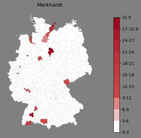 Relative Verteilung des Namens Markhardt (1996)Direkt zur Karte Die Farbskala zeigt die Anzahl von "Markhardt" bezogen auf je 1 Million Einträge. |