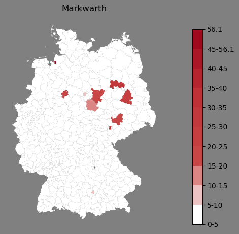 Relative Verteilung des Namens Markwarth (1996)Direkt zur Karte Die Farbskala zeigt die Anzahl von "Markwarth" bezogen auf je 1 Million Einträge. |