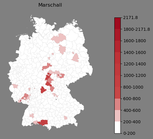 Absolute Verteilung des Namens Marschall (1890)Direkt zur Karte Absolute Verteilung des Namens "Marschall" um 1890 im damaligen Deutschen Reich Sie können die Karte innerhalb des Fensters zoomen und verschieben. |