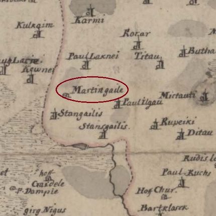 - Nach der Beschreibung im Hubenbuch hat die Ansiedlung Martin Gajel um 1719 in der Nähe von Spengen (1540 Stanißlaus Gaylus) - südöstlich von Memel - gelegen.[4]