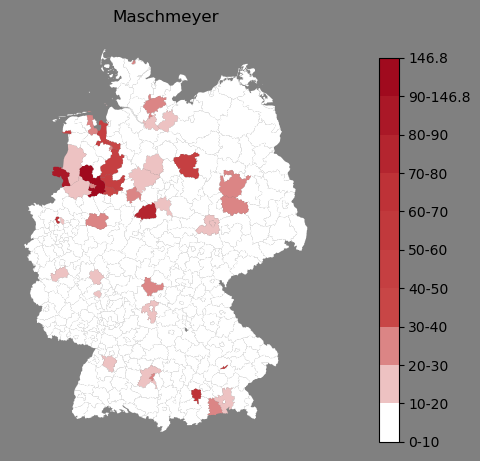 Absolute Verteilung des Namens Maschmeyer (1890)Direkt zur Karte Absolute Verteilung des Namens "Maschmeyer" um 1890 im damaligen Deutschen Reich Sie können die Karte innerhalb des Fensters zoomen und verschieben. |