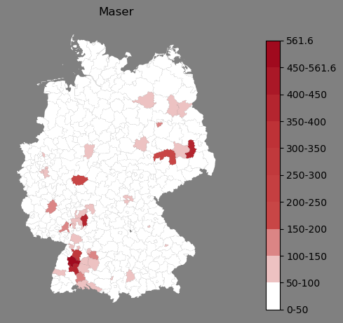 Relative Verteilung des Namens Maser (1996)Direkt zur Karte Die Farbskala zeigt die Anzahl von "Maser" bezogen auf je 1 Million Einträge. |