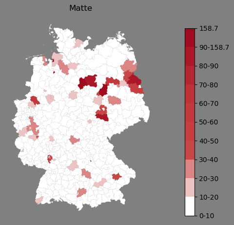 Relative Verteilung des Namens Matte (1996)Direkt zur Karte Die Farbskala zeigt die Anzahl von "Matte" bezogen auf je 1 Million Einträge. |