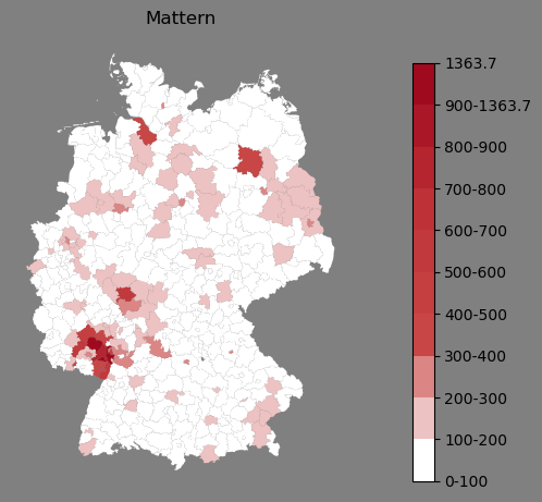 Absolute Verteilung des Namens Mattern (1890)Direkt zur Karte Absolute Verteilung des Namens "Mattern" um 1890 im damaligen Deutschen Reich Sie können die Karte innerhalb des Fensters zoomen und verschieben. |