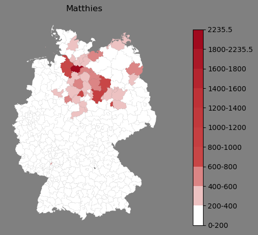 Absolute Verteilung des Namens Matthies (1890)Direkt zur Karte Absolute Verteilung des Namens "Matthies" um 1890 im damaligen Deutschen Reich Sie können die Karte innerhalb des Fensters zoomen und verschieben. |