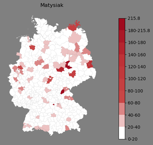 Relative Verteilung des Namens Matysiak (1996)Direkt zur Karte Die Farbskala zeigt die Anzahl von "Matysiak" bezogen auf je 1 Million Einträge. |