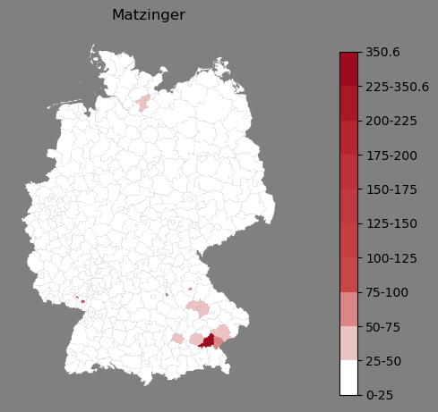 Relative Verteilung des Namens Matzinger (1996)Direkt zur Karte Die Farbskala zeigt die Anzahl von "Matzinger" bezogen auf je 1 Million Einträge. |