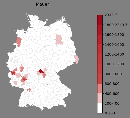 Absolute Verteilung des Namens Mauer (1890)Direkt zur Karte Absolute Verteilung des Namens "Mauer" um 1890 im damaligen Deutschen Reich Sie können die Karte innerhalb des Fensters zoomen und verschieben. |