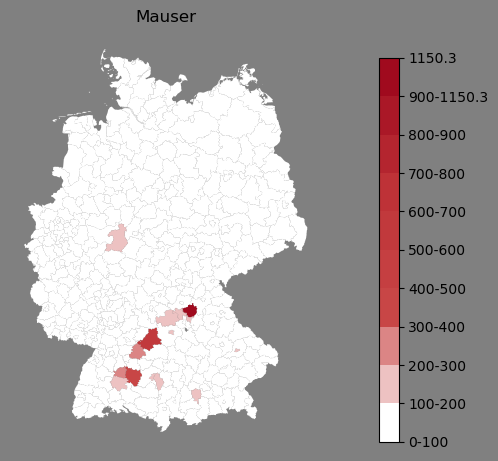 Absolute Verteilung des Namens Mauser (1890)Direkt zur Karte Absolute Verteilung des Namens "Mauser" um 1890 im damaligen Deutschen Reich Sie können die Karte innerhalb des Fensters zoomen und verschieben. |