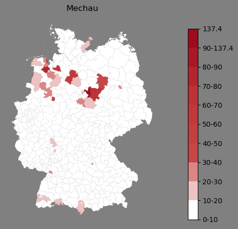 Relative Verteilung des Namens Mechau (1996)Direkt zur Karte Die Farbskala zeigt die Anzahl von "Mechau" bezogen auf je 1 Million Einträge. |