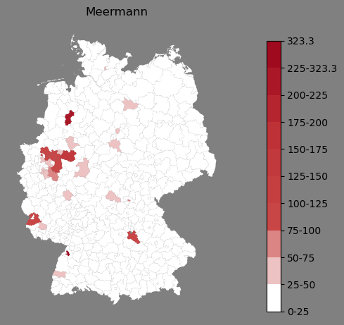 Absolute Verteilung des Namens Meermann (1890)Direkt zur Karte Absolute Verteilung des Namens "Meermann" um 1890 im damaligen Deutschen Reich Sie können die Karte innerhalb des Fensters zoomen und verschieben. |
