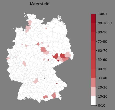 Relative Verteilung des Namens Meerstein (1996)Direkt zur Karte Die Farbskala zeigt die Anzahl von "Meerstein" bezogen auf je 1 Million Einträge. |