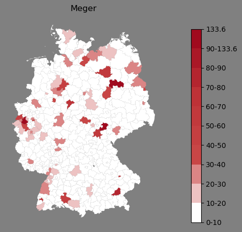 Relative Verteilung des Namens Meger (1996)Direkt zur Karte Die Farbskala zeigt die Anzahl von "Meger" bezogen auf je 1 Million Einträge. |