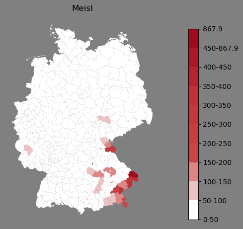 Relative Verteilung des Namens Meisl (1996)Direkt zur Karte Die Farbskala zeigt die Anzahl von "Meisl" bezogen auf je 1 Million Einträge. |