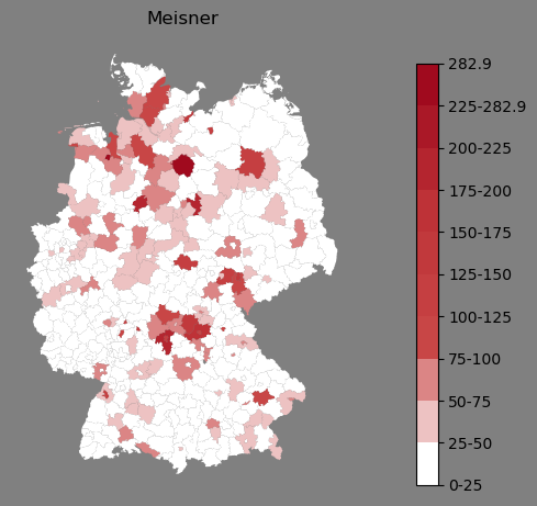 Relative Verteilung des Namens Meisner (1996)Direkt zur Karte Die Farbskala zeigt die Anzahl von "Meisner" bezogen auf je 1 Million Einträge. |