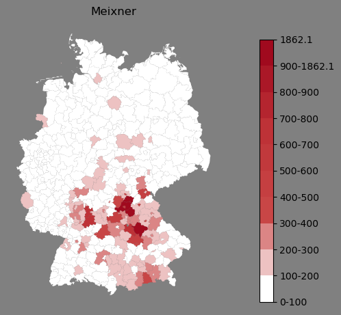 Relative Verteilung des Namens Meixner (1996)Direkt zur Karte Die Farbskala zeigt die Anzahl von "Meixner" bezogen auf je 1 Million Einträge. |