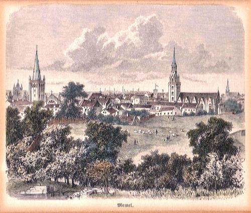 "Memel, die nördlichste Stadt Preussens, wurde schon 1250 angelegt und Klaipeda genannt, sie gehört nach wie vor in vielfacher Hinsicht zu den bedeutendsten Städten der Provinz. Sie liegt am Einfluss der Dange in die Ostsee, und ist nicht mehr befestigt, jetzt grösstentheils wohlgebaut, in die Alt- und Friedrichsstadt getheilt und hat einen guten Hafen, 3 Vorstädte, unter ihnen die vor dem Brückenthore, Crameist genannt, mit der katholischen Kirche, 4 Thore, die schöne Lindenstrasse, 3 evangelische Kirchen, 1 katholische-Kirche, 1 Synagoge, 1 Industrieschule, 1 Stadtschule, 1 Mädchenschule, eine Anstalt für verwahrloste Kinder, ein Hospital usw. Im Ganzen zählt man 27 öffentliche Gebäude, unter ihnen Zeughäuser, die Börse, das Theater usw. und 750 Privat-Wohnhäuser und gegen 10000 Einwohner. Im Jahre 1830 wurden hier 897 Kinder geboren und 1007 Personen starben. Hier ist ein Kreisamt, ein Land- und Stadtgericht, ein Intendanturamt, ein Oberpostamt, ein Hauptzollamt, eine Hafen-Polizei-Commission, ein Lootsen-Commando usw.